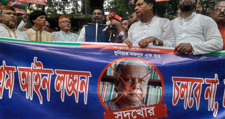 তিনি বলেন, আজকে পত্রিকা খুললে দেখতে পাচ্ছি, দেশের কিছু বিশিষ্ট ব্যক্তি বিবৃতি দিয়ে বলছেন, সারা বিশ্বে ড. ইউনূসের এতো জনপ্রিয়তা কিন্তু দেশে তাকে সম্মানহানি করা হচ্ছে। আমার প্রশ্ন, যারা ইউনূসের পক্ষে সাফাই গাচ্ছেন, তারা কি বোঝেন না, কেন এই দেশের মানুষ ড. ইউনূসের বিরুদ্ধে অবস্থান নিয়েছে? উনি শান্তিতে পুরস্কার পেলেন। উনি কি শান্তি বাংলাদেশে প্রতিষ্ঠা করেছেন? উনি মাইক্রোক্রেডিটে সুদের ব্যাবসা করেছেন। সেখান থেকে কোন শান্তি প্রতিষ্ঠা করেছেন? বরং গ্রামীণ ব্যাংকের ঋণ নিয়ে অন্তত ১০ হাজার মানুষ ঘরবাড়ি, ভিটেমাটি হারিয়ে ঢাকা শহরে এসে রিকশা চালায়। ড. ইউনূস ঋণ দেয়ার নাম করে গ্রামের মানুষকে শোষণ করেছে। কিস্তি দিতে গিয়ে মানুষ অসহায় হয়ে গেছে। কিস্তি না দিতে পারলে মানুষের ঘরের খাট, চাল, গরু নিয়ে গেছে। গ্রামীণ ব্যাংকের ঋণ শোধ করতে না পেরে লজ্জায়, দুঃখে, কষ্টে ৩৬ জন মানুষ আত্মহত্যা করতে বাধ্য হয়েছিল।