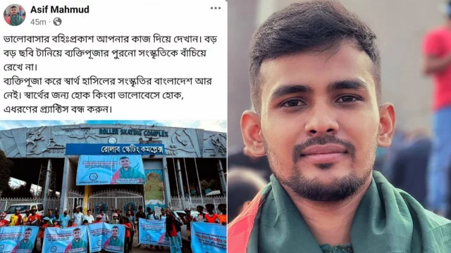 এরই পরিপ্রেক্ষিতে ব্যক্তিপূজা না করার জন্য অনুরোধ জানিয়ে শনিবার মধ্যরাতে তার ফেসবুক আইডিতে একটি স্ট্যাটাস দিয়েছেন ক্রীড়া উপদেষ্টা আসিফ মাহমুদ। সেখানে তিনি লেখেন, ‘ভালোবাসার বহিঃপ্রকাশ আপনার কাজ দিয়ে দেখান। বড় বড় ছবি টানিয়ে ব্যক্তিপূজার পুরোনো সংস্কৃতিকে বাঁচিয়ে রেখে না। ব্যক্তিপূজা করে স্বার্থ হাসিলের সংস্কৃতির বাংলাদেশ আর নেই। স্বার্থের জন্য হোক কিংবা ভালোবেসে হোক, এ ধরনের প্র্যাক্টিস বন্ধ করুন।’