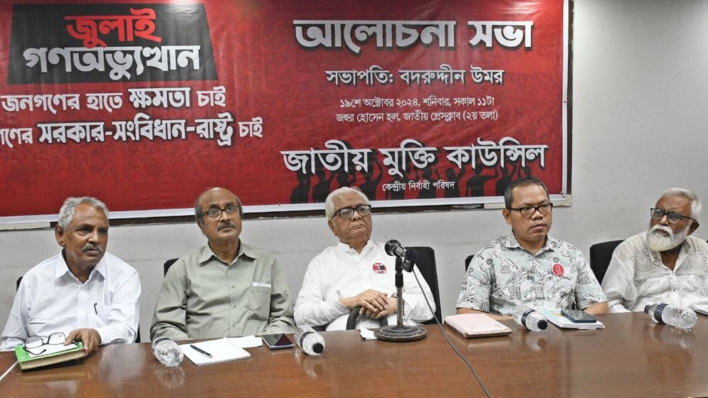 ‘জুলাই গণঅভ্যুত্থান: জনগণের হাতে ক্ষমতা চাই, জনগণের সরকার-সংবিধান-রাষ্ট্র চাই’ শীর্ষক এক আলোচনা সভায় সভাপতির বক্তব্যে বদরুদ্দীন উমর একথা বলেন। আজ শনিবার দুপুরে জাতীয় প্রেসক্লাবে জাতীয় মুক্তি কাউন্সিল এই সভার আয়োজন করে।