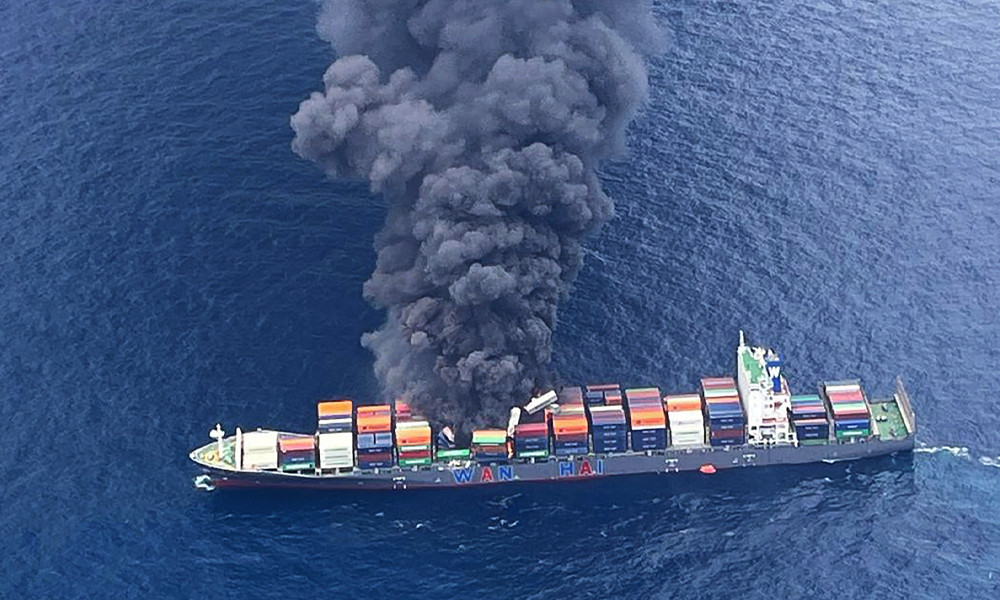 কোস্ট গার্ডের বিমান থেকে তোলা ছবিতে দেখা যায়, জাহাজটি থেকে ঘন কালো ধোঁয়া উড়ছে এবং একটি শক্তিশালী বিস্ফোরণের কারণে কিছু কনটেইনার উড়ে গেছে বলে মনে হচ্ছে।