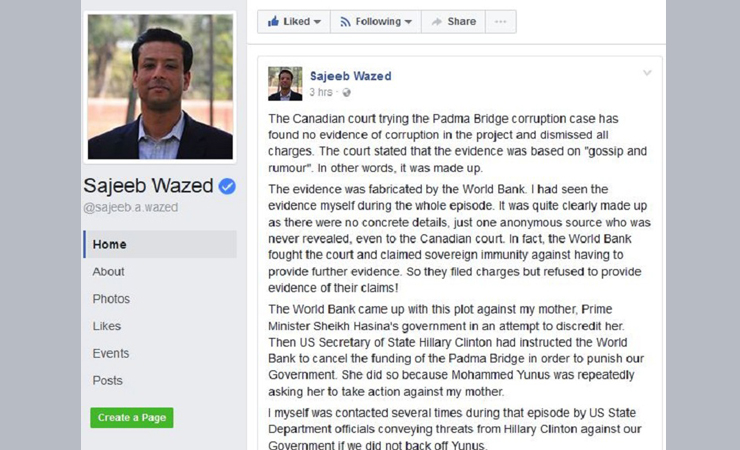 পদ্মাসেতু প্রকল্পে দুর্নীতির অভিযোগ তুলে যারা এই সেতুর কাজ পিছিয়ে দিয়েছেন তাদেরকে ক্ষমতা চাওয়ার আহ্বান জানিয়েছেন প্রধানমন্ত্রীর তথ্যপ্রযুক্তি বিষয়ক উপদেষ্টা সজীব ওয়াজেদ জয়। পদ্মাসেতু প্রকল্পে দুর্নীতির ষড়যন্ত্রের মামলা নাকচ করে কানাডার আদালতের রায় দেয়ার পর নিজের ফেসবুক পেজে জয় এ কথা বলেন।